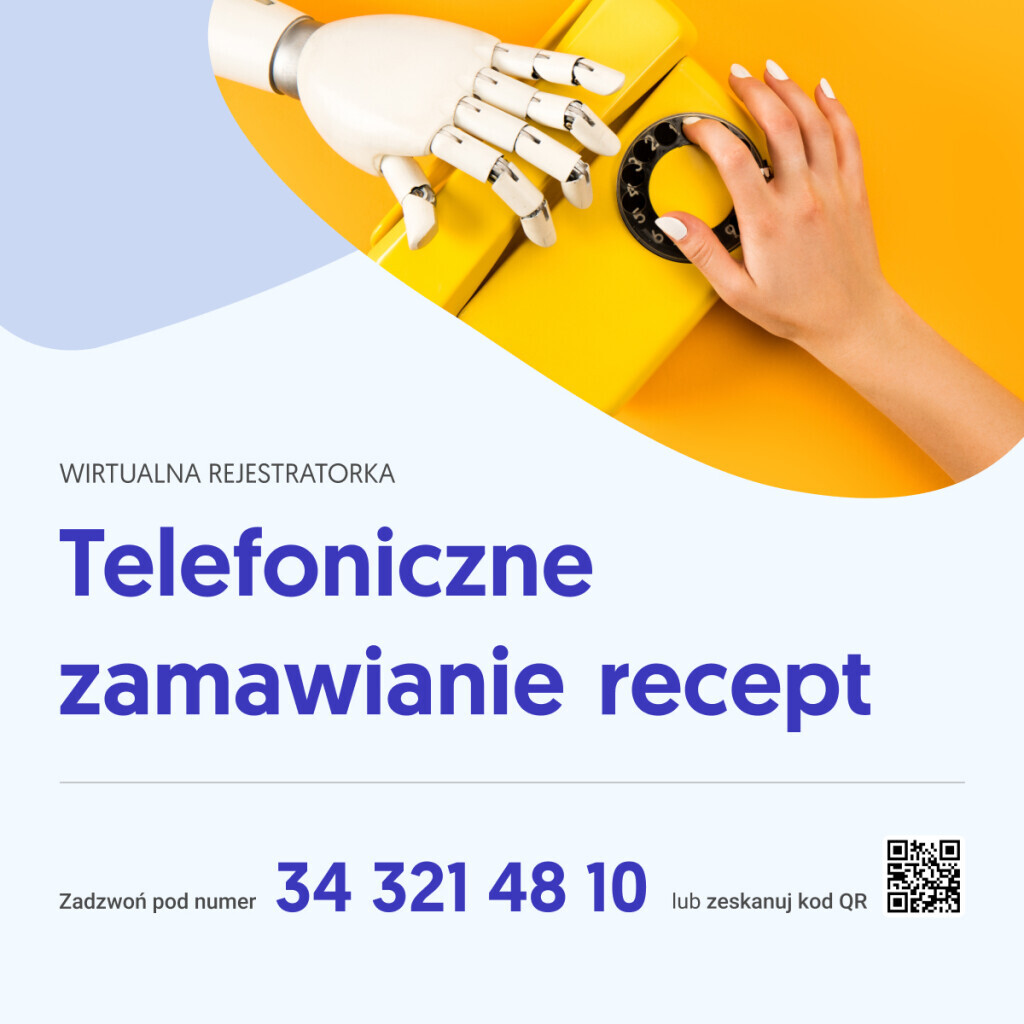 Pacjenci zdeklarowani do poradni POZ mają możliwość 7 dni w tygodniu / 24 godziny na dobę zadzwonić pod numer: 34 321 48 10 i zamówić leki za pomocą rozmowy z wirtualną rejestratorką.